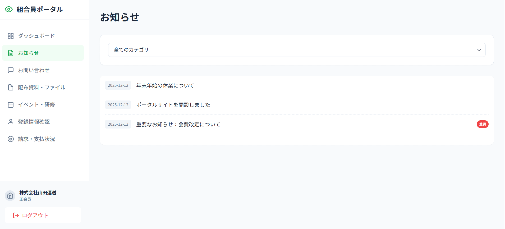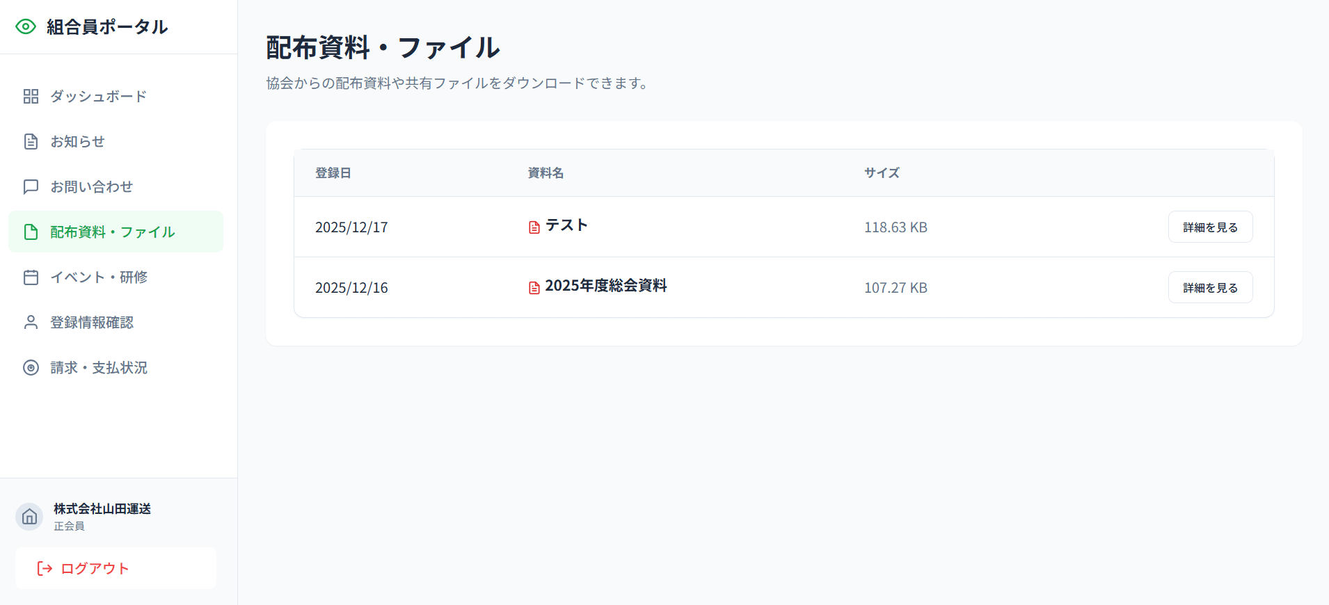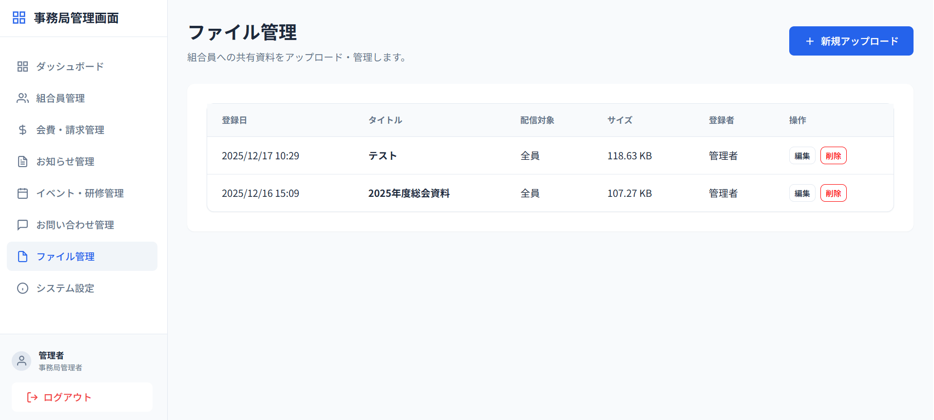 - ドキュメント共有: 協会から組合員へ共有する重要書類(PDF等)のアップロード・管理