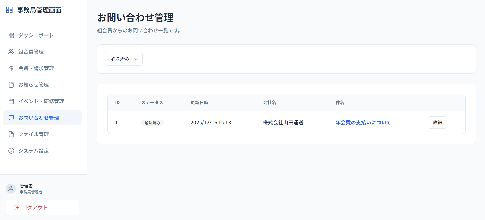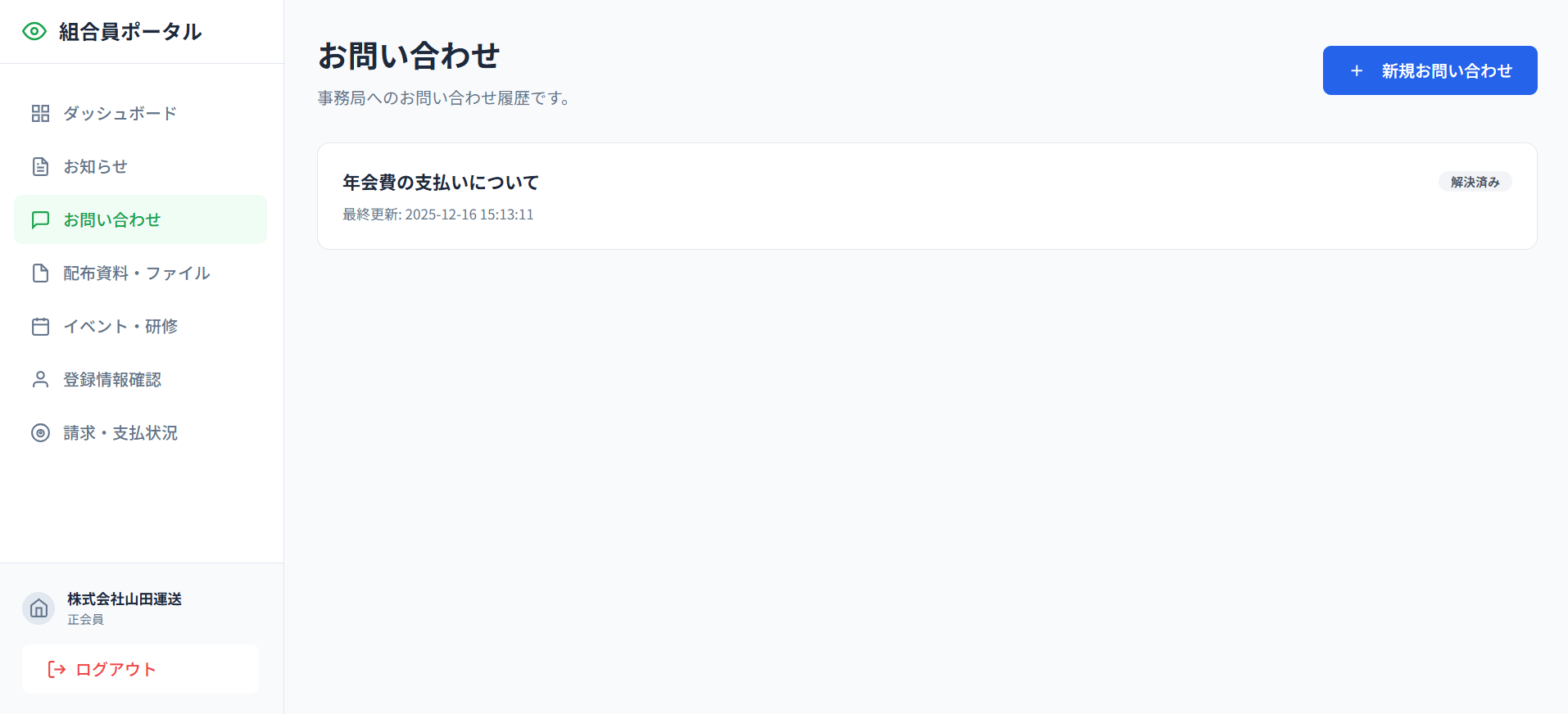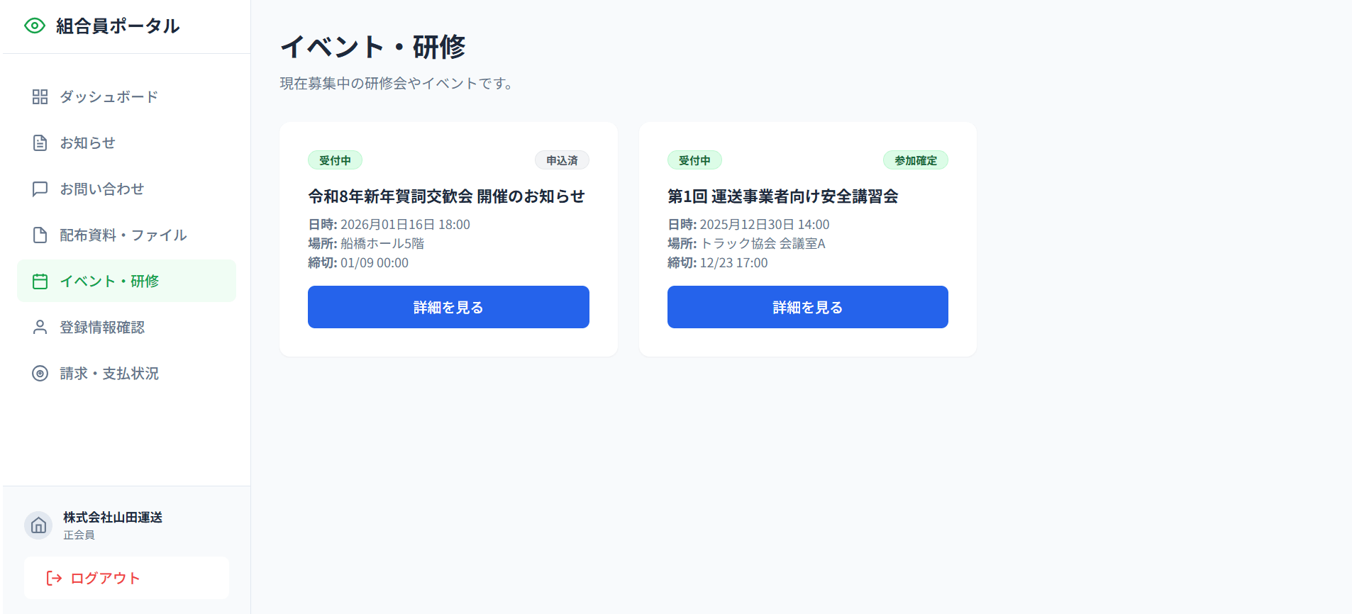 - ドキュメント共有: 協会から組合員へ共有する重要書類(PDF等)のアップロード・管理