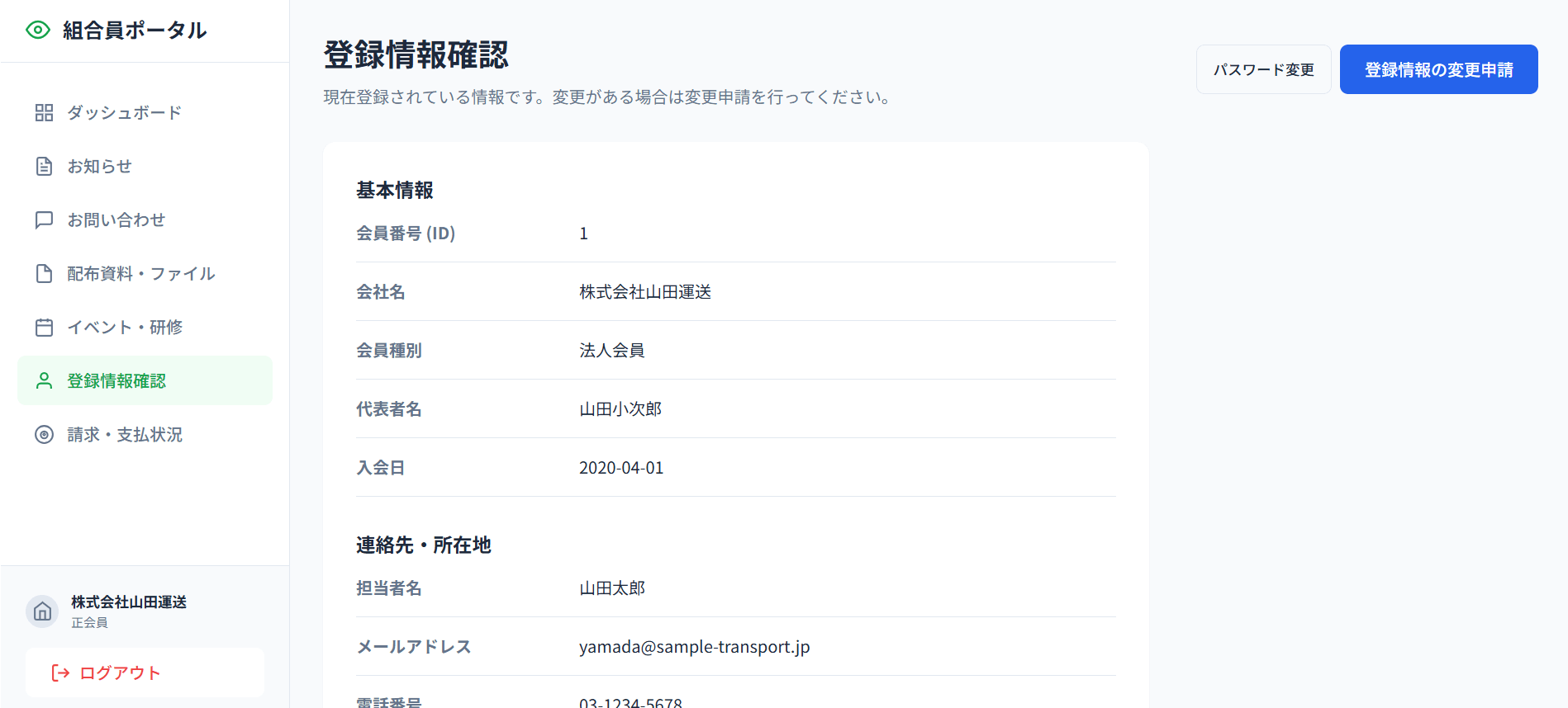 - 変更申請: 基本情報の変更をオンラインで事務局へ申請(事務局の承認後に反映)