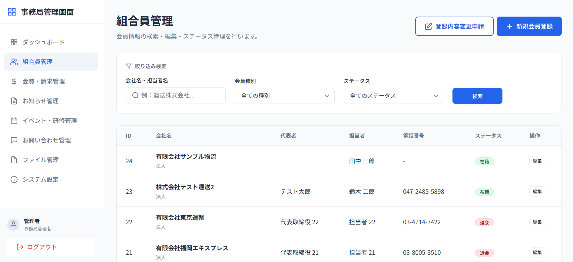 - 登録内容変更承認: 組合員から申請された社名や住所などの変更依頼の確認・承認