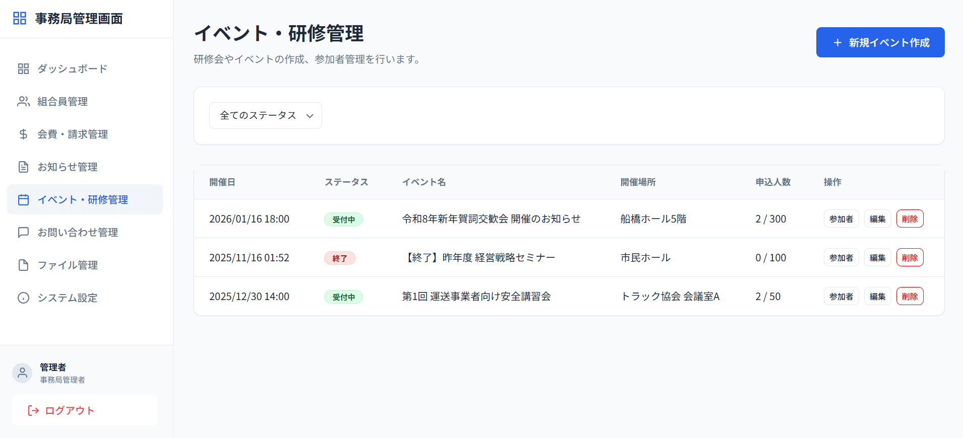 - 講習会等の作成: 研修会やイベントの開催情報登録